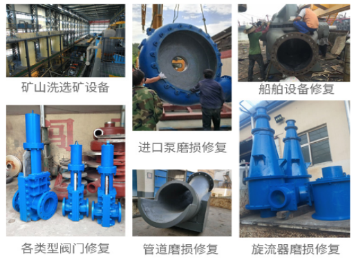 主要應(yīng)用于:選礦設(shè)備過流沖蝕磨損修復(fù),如:旋風(fēng)分離器,浮選柱,浮選機(jī),泡沫罐,分級機(jī),攪拌罐等設(shè)備的預(yù)涂耐磨層,溜槽的維修,管道配件,渣漿泵和其他設(shè)備(典型用途請參見主要物理和機(jī)械性能表)。
